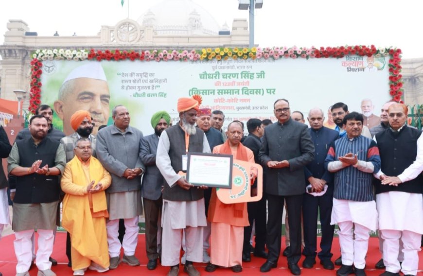 मुख्यमंत्री योगी ने किसान सम्मान दिवस पर किसानों का उत्साह बढ़ाते हुए कहा कि सर्दी, गर्मी की परवाह किए बिना जब वह पसीना बहाता है और सर्दी को अपनी अस्थियों में समाहित कर ऊर्जा का प्रवाह धरती मां के साथ करता है तो खेती अन्न उत्पादन के रूप में सोना उगलती है। मुख्यमंत्री ने पूर्व प्रधानमंत्री भारत रत्न चौधरी चरण सिंह के जन्मदिवस पर उनकी प्रतिमा पर पुष्प अर्पित किया। सीएम ने ‘किसान सम्मान दिवस’ पर किसानों को ट्रैक्टर की चाबी दी। साथ ही किसानों, वैज्ञानिकों, एफपीओ आदि को सम्मानित किया।