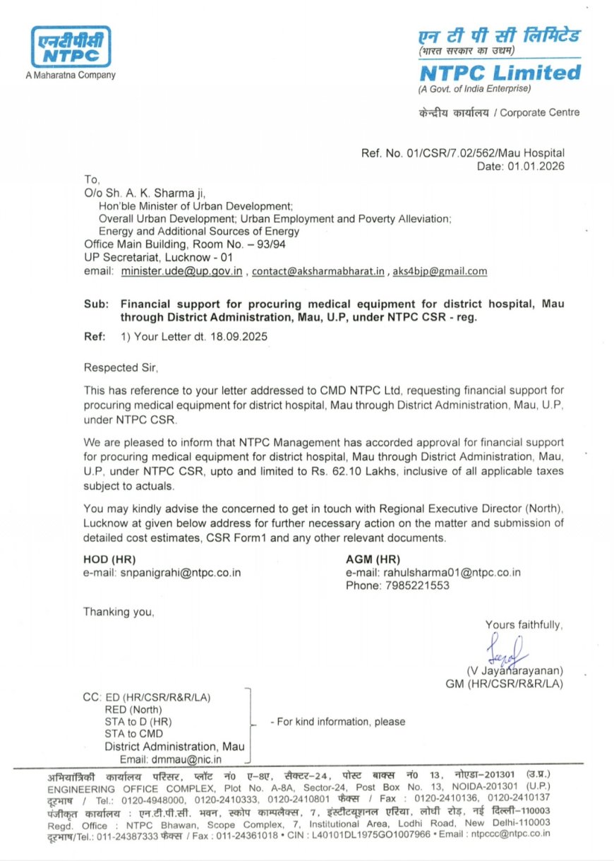 लखनऊ(हिन्द भास्कर):- नगर विकास एवं ऊर्जा मंत्री ए.के. शर्मा के प्रयासों से जनपद मऊ में स्वास्थ्य सेवाओं के सुदृढ़ीकरण की दिशा में एक महत्वपूर्ण उपलब्धि हासिल हुई है। उनके विशेष प्रयासों के परिणामस्वरूप भारत सरकार के उपक्रम एनटीपीसी के सहयोग से जिला अस्पताल मऊ में 62.10 लाख रुपये की लागत से अत्याधुनिक चिकित्सा उपकरणों की स्थापना की जाएगी, जिससे जिले की स्वास्थ्य व्यवस्था को नया बल मिलेगा।