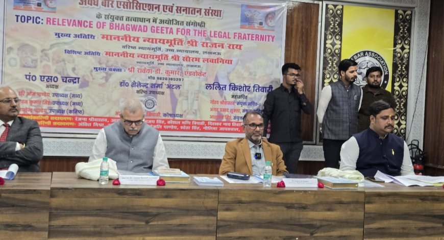 लखनऊ(हिन्द भास्कर):- गीता जयंती के सुअवसर पर सनातनम संस्था, लखनऊ एवं अवध बार एसोसिएशन, लखनऊ हाईकोर्ट के संयुक्त तत्वाधान में नवनिर्मित हाईकोर्ट गोमती नगर, लखनऊ के महामना हाल में एक संगोष्ठी का आयोजन किया गया। इस संगोष्ठी में न्यायिक व्यवस्था में भगवतगीता की प्रासंगिकता एवं इसके महत्व पर व्याख्यान सहित काव्य पाठ का आयोजन किया गया।