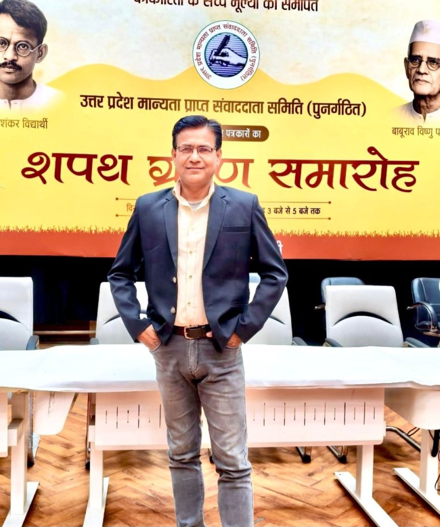 लखनऊ(हिन्द भास्कर):- उत्तर प्रदेश मान्यता प्राप्त संवाददाता समिति (पुनर्गठित) के पदाधिकारियों का शपथ ग्रहण समारोह जनभवन (राजभवन) के समक्ष स्थित विश्वेश्वरैया हाल में भव्य एवं गरिमामयी ढंग से संपन्न हुआ। संयोजक प्रभात त्रिपाठी ने कहा कि पत्रकारों के सम्मान और स्वाभिमान से कोई समझौता नहीं किया जाएगा। कार्यक्रम श्रद्धेय पत्रकार पुरोधा गणेश शंकर विद्यार्थी तथा बाबूराव विष्णु पराड़कर के आदर्शों को समर्पित रहा।
