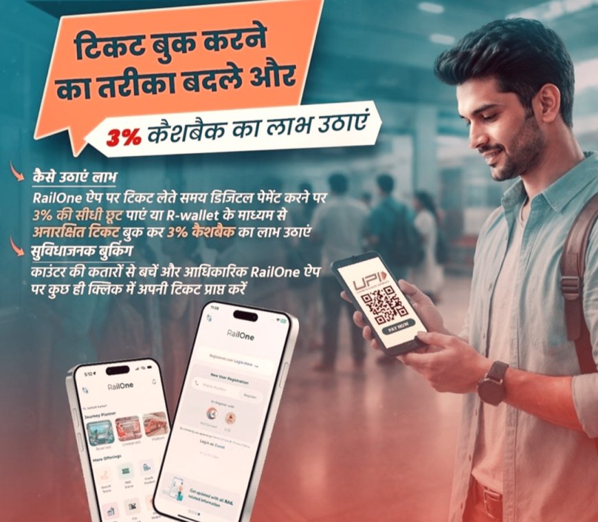 आप को बता दे रेलवे ने यात्रियों को डिजिटल माध्यम से टिकट बुकिंग कराने के लिए ‘रेल वन एप’(Rail One app) पर विशेष प्रावधान लागू करने का निर्णय लिया गया है। जिस के अंतर्गत अब ‘रेल वन एप’ पर R&Wallet(आर-वॉलेट) को छोड़कर सभी डिजिटल भुगतान जैसे( यूपीआई, डेबिट/क्रेडिट कार्ड आदि) से अनारक्षित टिकट बुक कराते है तो उन्हें 3% की बोनस कैशबैक की सुविधा प्रदान की जा रही है।